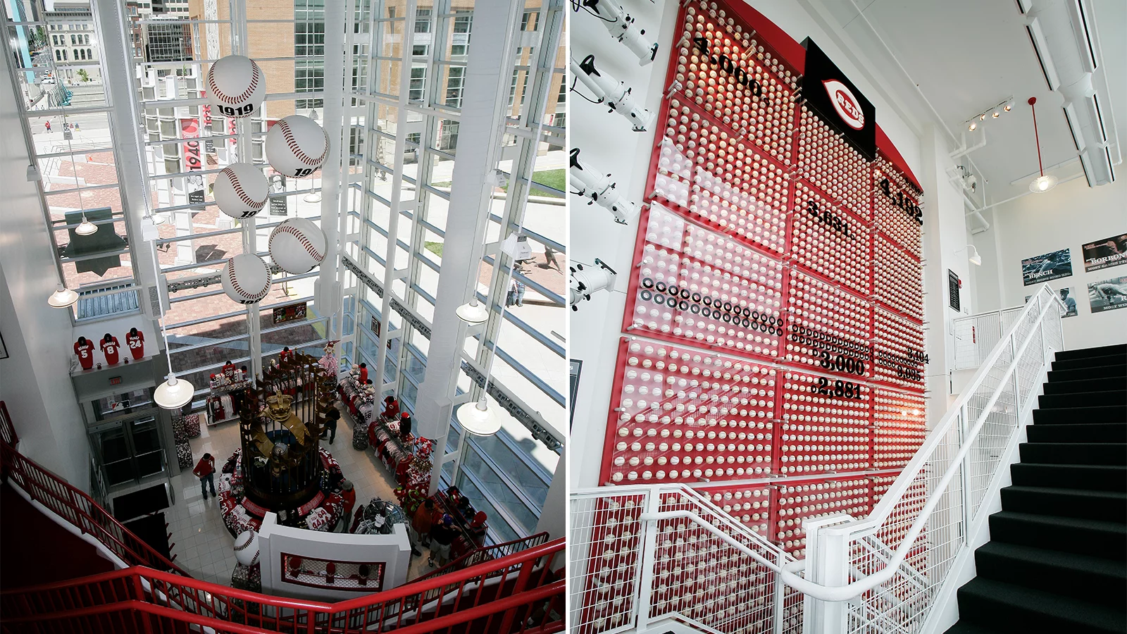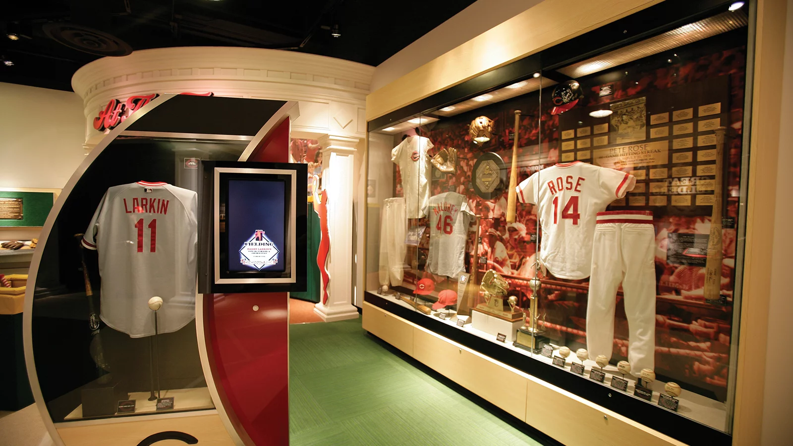 kubik maltbie was responsible for the fabrication and installation of an interactive component that allows the visitor to step into the batter’s box to watch a 95mph fastball whiz by; video kiosks at each interactive feature highlight a Red’s player describing the keys to be a successful pitcher, hitter and fielder; glass showcases, freestanding and wall mounted vitrines housing artifacts and memorabilia.